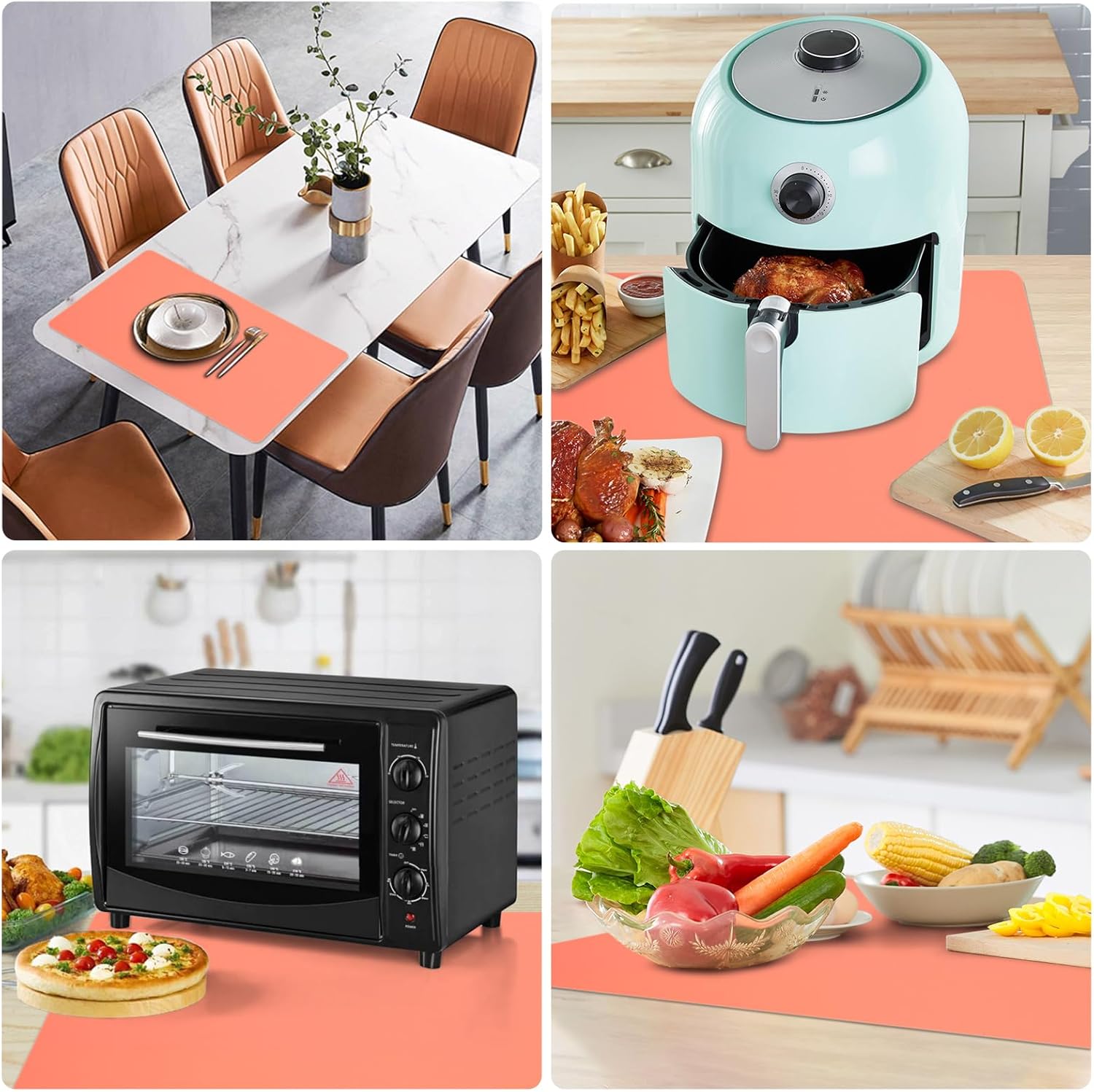 - Extra large silicone mat: Size of 48” x 24”, almost can fit most kitchen countertops, dining tables and other workbench. It can be placed under the air fryer, microwave, toaster oven, induction stove, coffee maker to protect the kitchen countertops and other surfaces against spills, scratches, grease, heat, etc. It’s cuttable to fit different sizes and shapes.